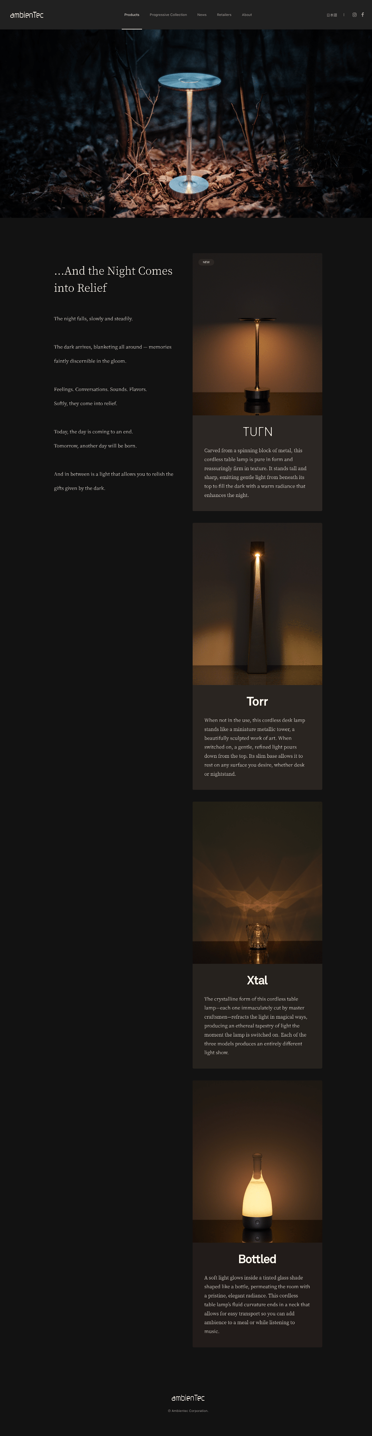 「暗みを楽しむための灯り」をテーマに、照明器具を制作する株式会社アンビエンテックのブランドサイトを実装しました。アンビエンテックの製品のように、暗がりにあたたかい光が浮かび上がるような演出を施し、ブランドサイトからプロダクトのストーリーを感じ取ってもらえるように表現しました。 クライアント株式会社アンビエンテック担当フロントエンド実装