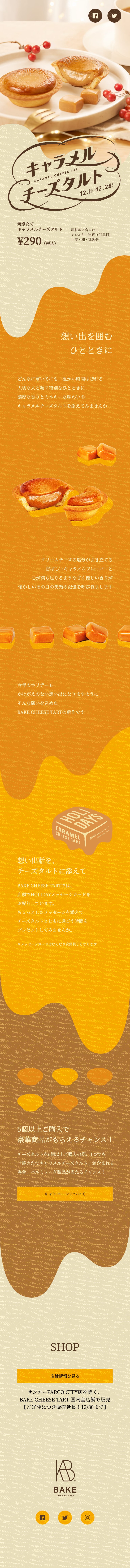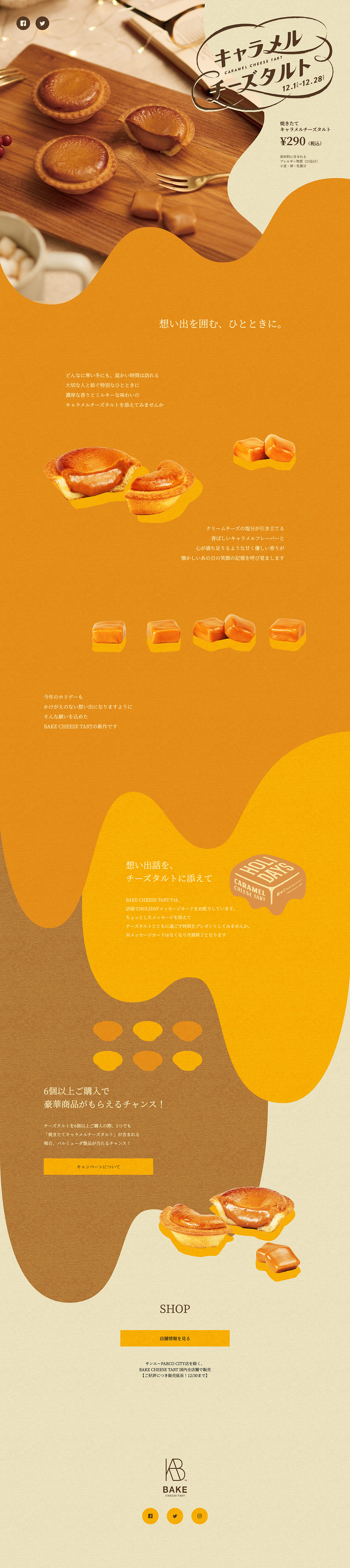 BAKEのキャラメルチーズタルトの特設ページを実装しました。キャラメルチーズのとろりとした質感を、背景や画像が溶け出すような演出で表現しました。