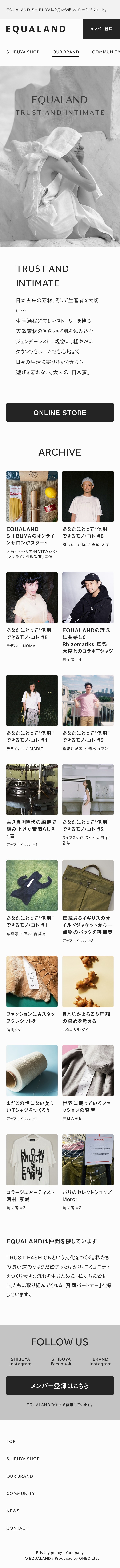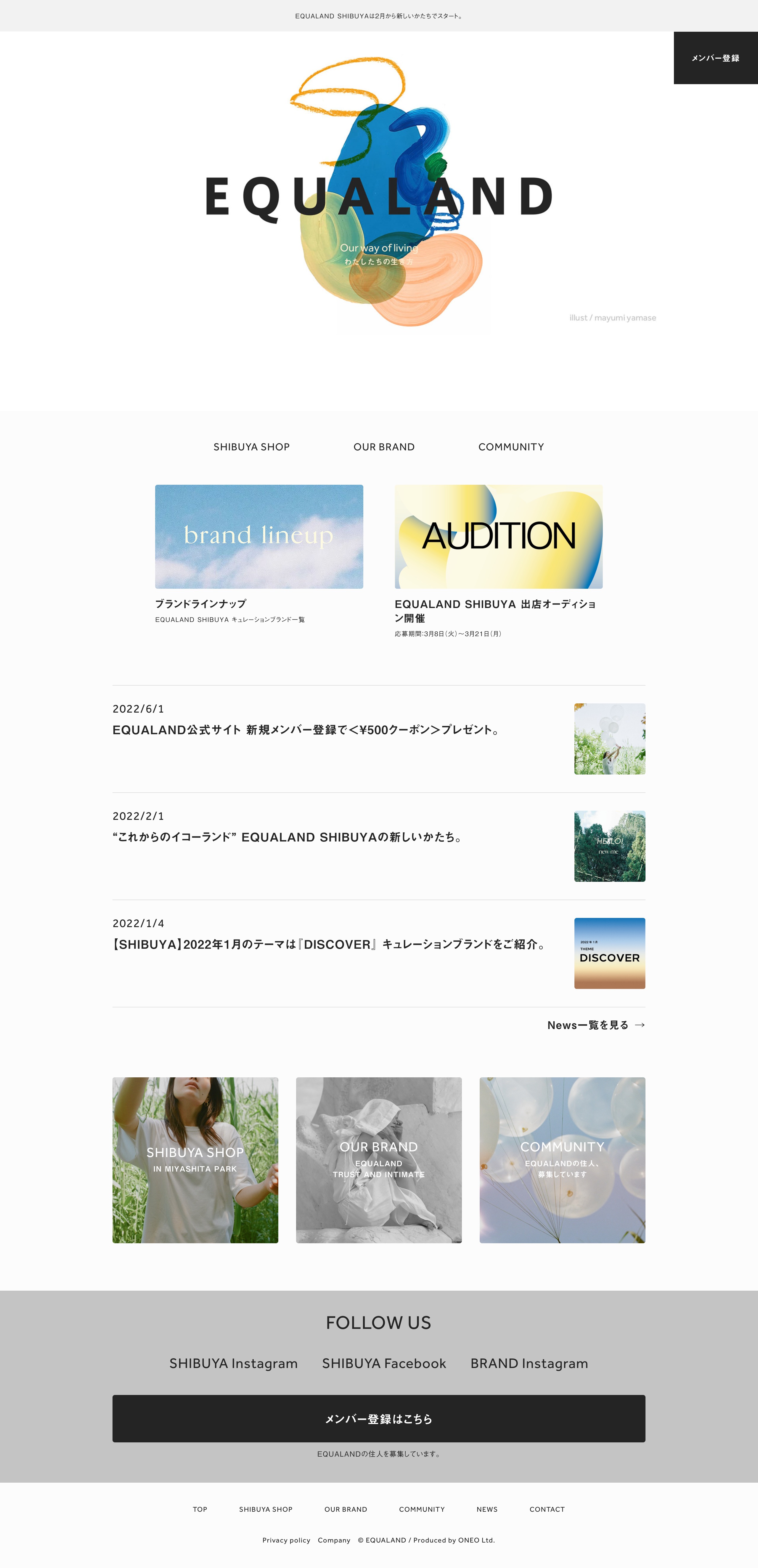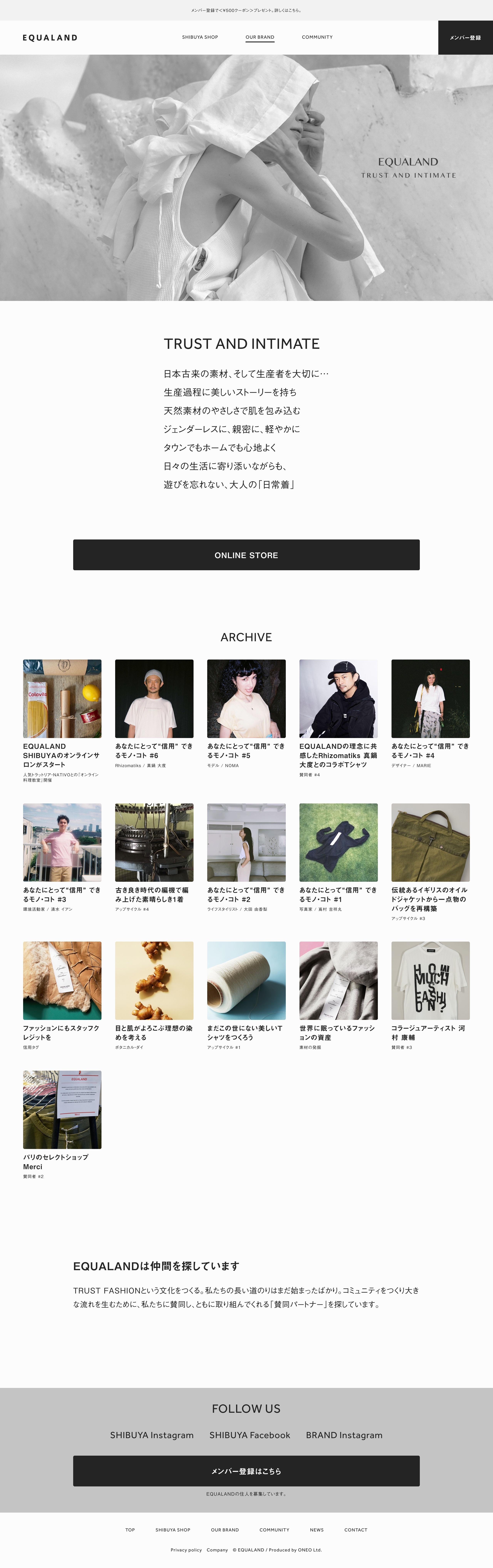 自身がたいせつにしたいと思えるモノやコトを見つけてもらうため、「TRUST=“信用・信頼”」をコンセプトに持つEQUALAND。 MIYASHITA PARKに構える「EQUALAND SHIBUYA」で開催されるマーケットの出店ブランドの紹介や、オリジナルブランド「TRUST AND INTIMATE」の想いに触れ、自身の「たいせつ」に耳を傾けたくなるような体験を楽しんでもらえたらと思います。 クライアント株式会社ワンオー担当フロントエンド実装