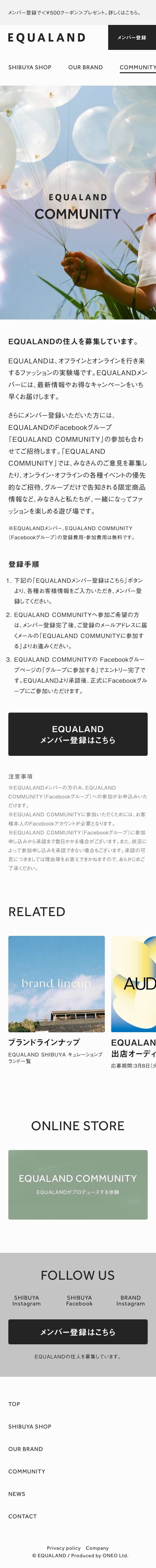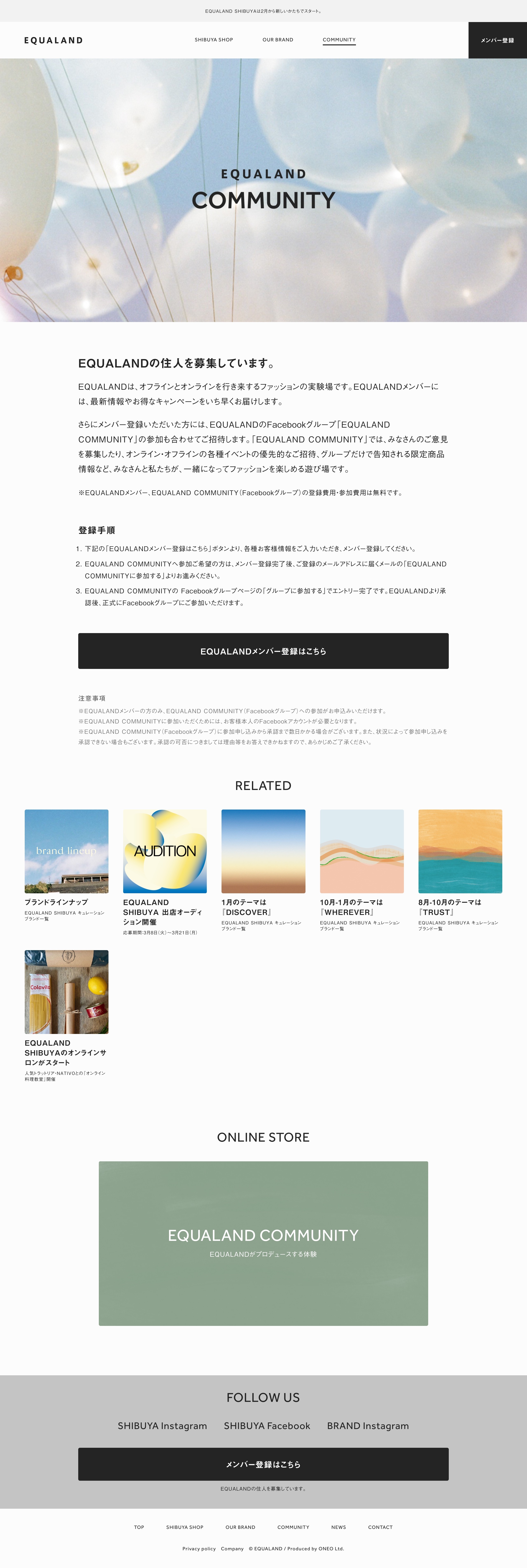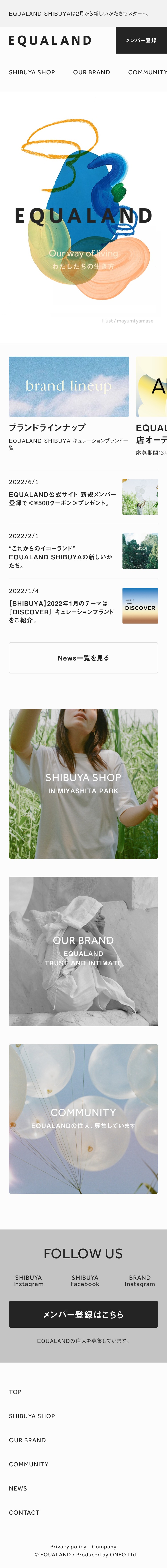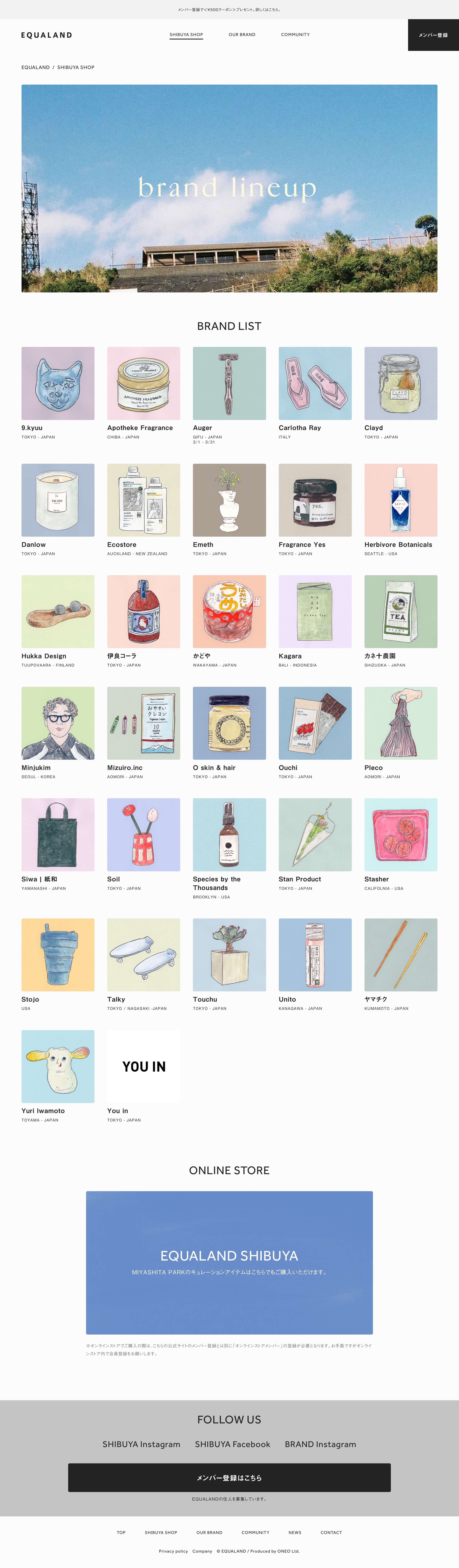 自身がたいせつにしたいと思えるモノやコトを見つけてもらうため、「TRUST=“信用・信頼”」をコンセプトに持つEQUALAND。 MIYASHITA PARKに構える「EQUALAND SHIBUYA」で開催されるマーケットの出店ブランドの紹介や、オリジナルブランド「TRUST AND INTIMATE」の想いに触れ、自身の「たいせつ」に耳を傾けたくなるような体験を楽しんでもらえたらと思います。 クライアント株式会社ワンオー担当フロントエンド実装