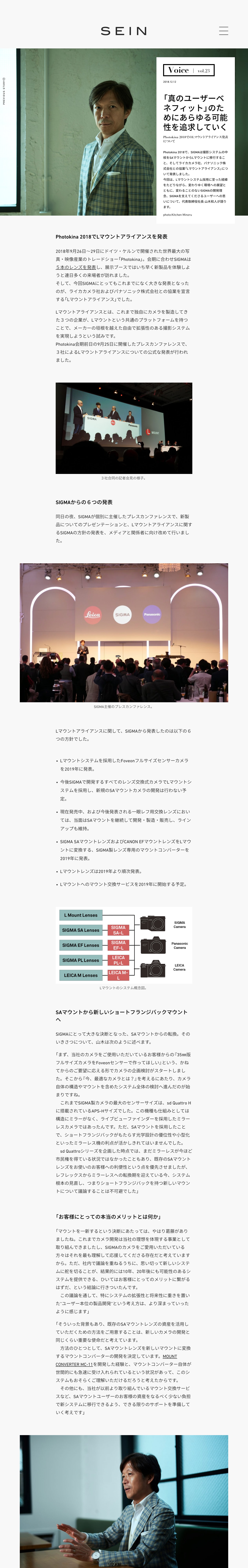 SIGMAのオウンドメディア、SEINのオンラインマガジン化のアートディレクション・デザインを担当しました。 SIGMAのプロダクト同様、機能性と品位の高度な両立を目指した「あるべき姿」をデザインすることを心がけ、2018年1月末の立ち上げ以来、150を超える国々からのアクセスがあり、CIコミュニケーション、ブランド認知に貢献しています。 クライアント株式会社シグマ担当UIデザイン(Web)
